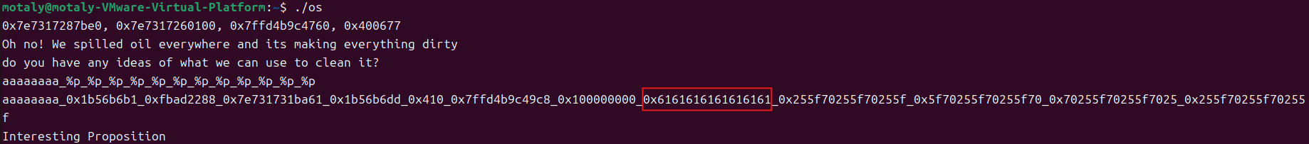 分析 main函数 1 2 3 4 5 6 7 8 9 10 11 12 13 14 15 16 int __fastcall main(int argc, const char **argv, const char **envp) { char s[312]; // [rsp+10h] [rbp-140h] BYREF unsigned __int64 v5; // [rsp+148h] [rbp-8h] v5 = __readfsqword(0x28u); printf("%p, %p, %p, %p\n", &puts, &printf, s, temp); puts("Oh no! We spilled oil everywhere and its making everything dirty"); puts("do you have any ideas of what we can use to clean it?"); fflush(stdout); fgets(s, 300, stdin); printf(s); puts(x); // "Interesting Proposition" fflush(stdout); return 0; }