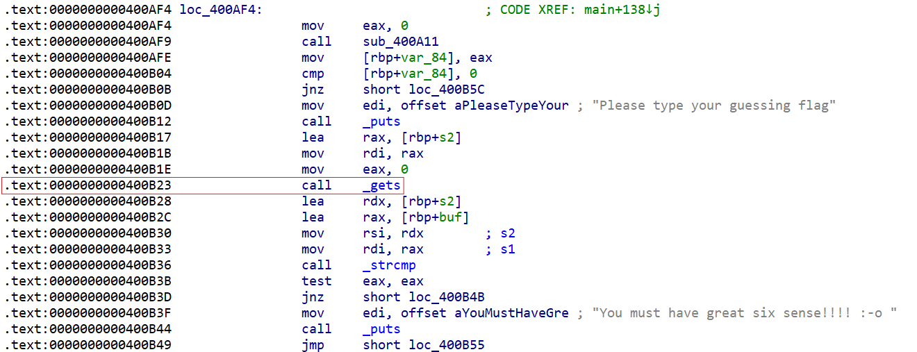 分析 main函数 1 2 3 4 5 6 7 8 9 10 11 12 13 14 15 16 17 18 19 20 21 22 23 24 25 26 27 28 29 30 31 32 33 34 35 36 37 38 39 40 41 42 43 __int64 __fastcall main(__int64 a1, char **a2, char **a3) { __WAIT_STATUS stat_loc; // [rsp+14h] [rbp-8Ch] BYREF __int64 n3_1; // [rsp+20h] [rbp-80h] __int64 n3; // [rsp+28h] [rbp-78h] char buf[48]; // [rsp+30h] [rbp-70h] BYREF char s2[56]; // [rsp+60h] [rbp-40h] BYREF unsigned __int64 v10; // [rsp+98h] [rbp-8h] v10 = __readfsqword(0x28u); n3 = 3LL; LODWORD(stat_loc.__uptr) = 0; n3_1 = 0LL; sub_4009A6(a1, a2, a3); HIDWORD(stat_loc.__iptr) = open("./flag.txt", 0); if ( HIDWORD(stat_loc.__iptr) == -1 ) { perror("./flag.txt"); _exit(-1); } read(SHIDWORD(stat_loc.__iptr), buf, 0x30uLL); close(SHIDWORD(stat_loc.__iptr)); puts("This is GUESS FLAG CHALLENGE!"); while ( 1 ) { if ( n3_1 >= n3 ) { puts("you have no sense... bye :-) "); return 0LL; } if ( !(unsigned int)sub_400A11() ) break; ++n3_1; wait((__WAIT_STATUS)&stat_loc); } puts("Please type your guessing flag"); gets(s2); if ( !strcmp(buf, s2) ) puts("You must have great six sense!!!! :-o "); else puts("You should take more effort to get six sence, and one more challenge!!"); return 0LL; }