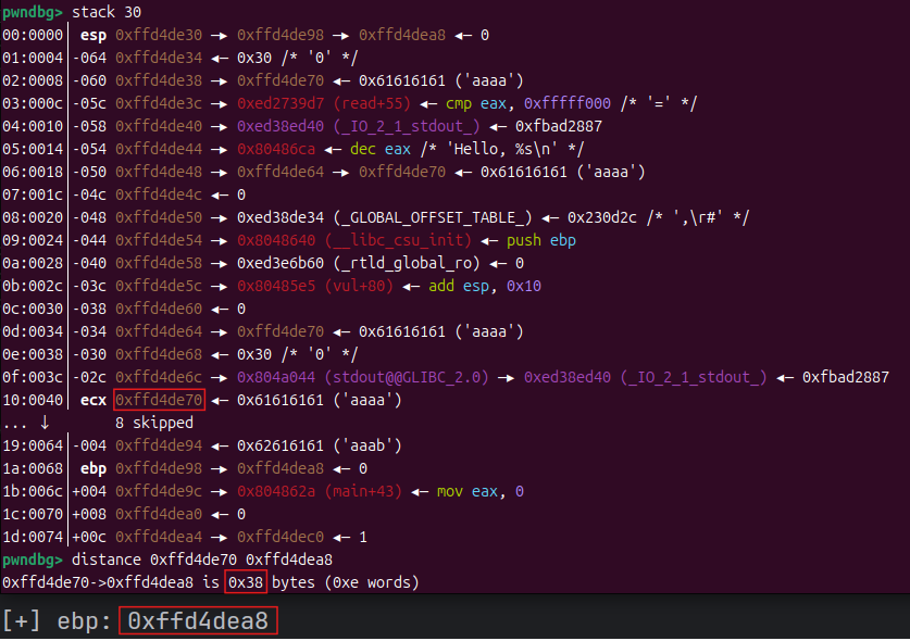 io.recvuntil(b'b') ebp=u32(io.recv(4).ljust(4,b'\x00')) log.success('ebp: '+hex(ebp))