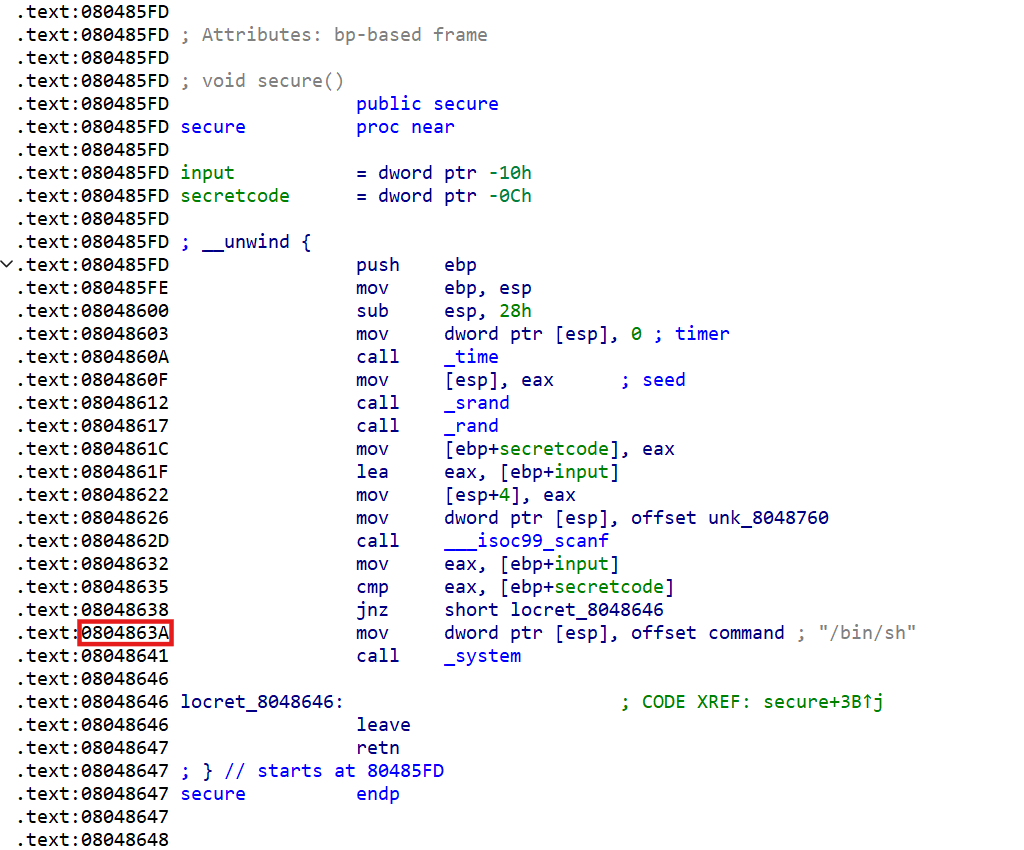 void secure() { time_t seed; // eax int input; // [esp+18h] [ebp-10h] BYREF int secretcode; // [esp+1Ch] [ebp-Ch]