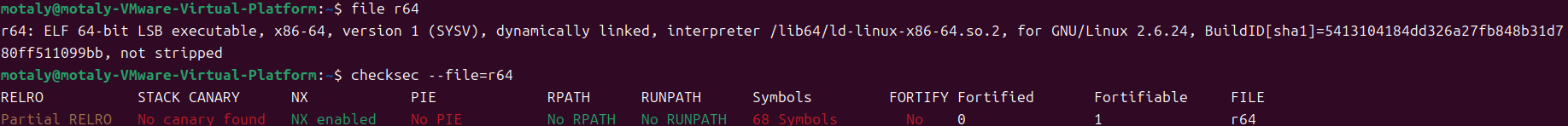 motaly@motaly-VMware-Virtual-Platform:~$ gdb r64 GNU gdb (Ubuntu 15.0.50.20240403-0ubuntu1) 15.0.50.20240403-git Copyright (C) 2024 Free Software Foundation, Inc. License GPLv3+: GNU GPL version 3 or later <http://gnu.org/licenses/gpl.html> This is free software: you are free to change and redistribute it. There is NO WARRANTY, to the extent permitted by law. Type "show copying" and "show warranty" for details. This GDB was configured as "x86_64-linux-gnu". Type "show configuration" for configuration details. For bug reporting instructions, please see: <https://www.gnu.org/software/gdb/bugs/>. Find the GDB manual and other documentation resources online at: <http://www.gnu.org/software/gdb/documentation/>.