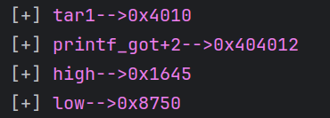 log.success(xilker(f'tar1-->{hex(tar1)}')) log.success(xilker(f'printf_got+2-->{hex(printf_got+2)}')) log.success(xilker(f'high-->{hex(high)}')) log.success(xilker(f'low-->{hex(low)}'))